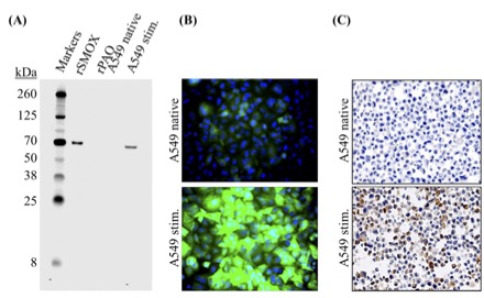 Figure 1. The developed monoclonal antibodies are suitable for most analytical applications. (A) Western blot analysis: Signal intensities were 8–13-fold higher in stimulated versus non-stimulated A549 cells, with negligible background staining (representative SMAB3 clone shown). (B) Immunofluorescence analysis: Strong fluorescence intensities was seen in the stimulated A549 cells and not in the non-stimulated cells (representative SMAB3 clone shown). (C) Immunohistochemical analysis: A clear contrast was seen between the staining in stimulated versus non-stimulated A549 cells (representative SMAB10 clone shown).